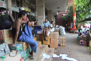 【写真キャプション】第二の都市、マンダレーの市場前にて。