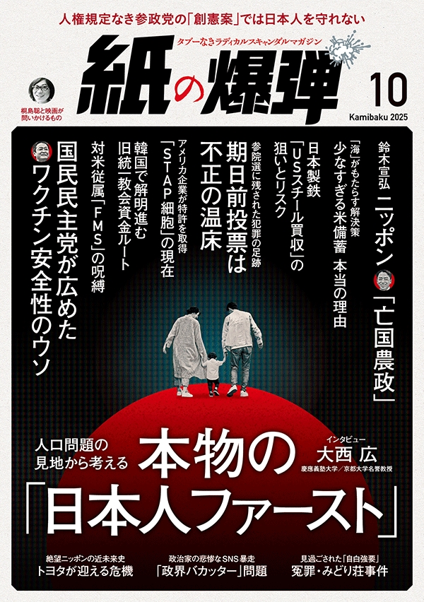ほか今月号では、10月13日閉幕の「2025大阪・関西万博」の“成功”をアピールしながら“辞任ドミノ”に揺れる維新の内情を解説。「大川原化工機事件」違法捜査が明らかとなった公安警察の歴史、国際表現規制といわれる「ハノイ条約」について提案国・ロシア外務省を取材、ネパール・インドネシアなどで相次ぐ“デモ暴動化”の理由、「アフリカ・ホームタウン騒動」の裏側など、本誌独自の視点でレポートをお届けします。『紙の爆弾』は全国書店で発売中です。ぜひご一読ください。
