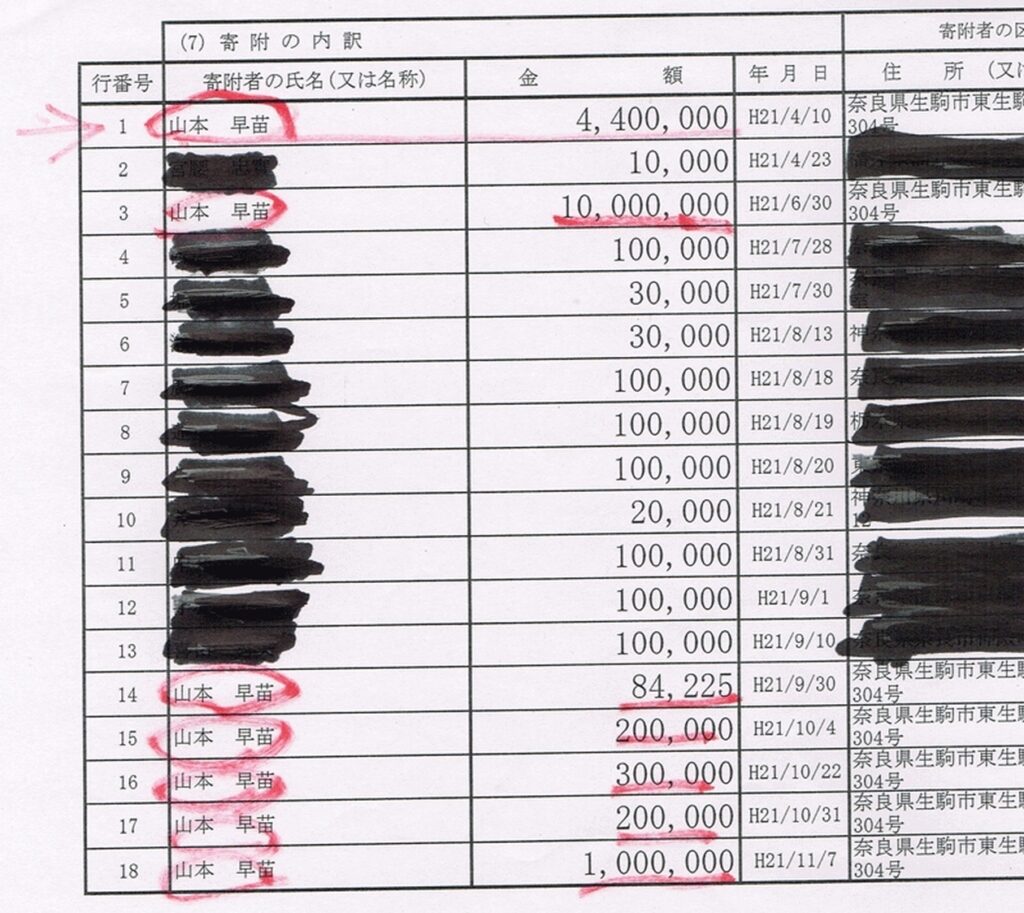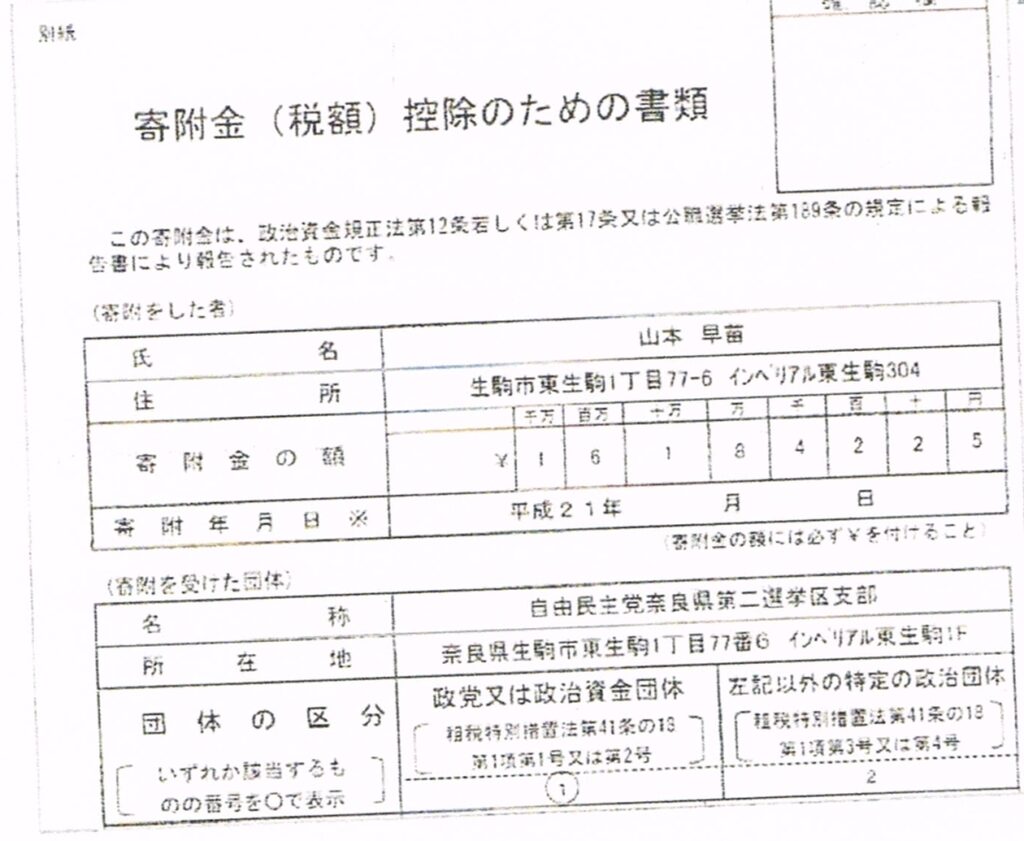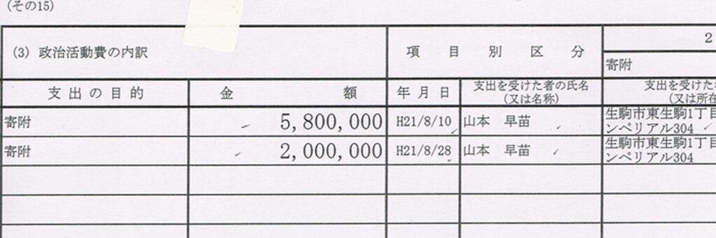 2009年8月10日に580万円、8月28日に200万円の寄付を受けている。これを原資とし、その他の「資金」も加算し、2009年度に「山本早苗」の名前で、総額約1620万を自分の政党支部に寄付している。