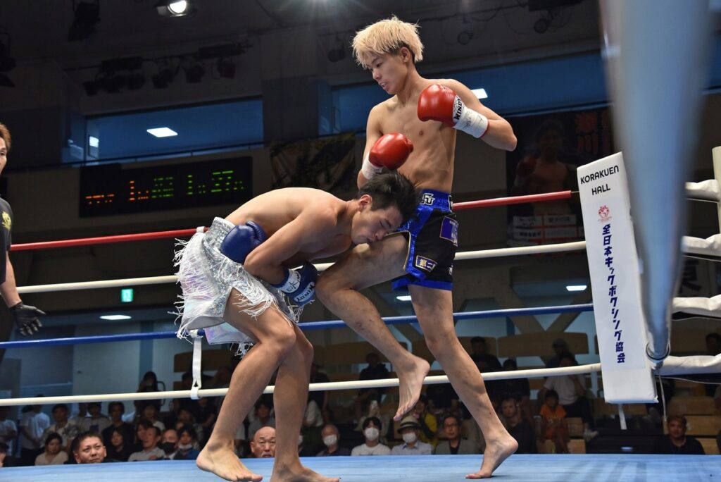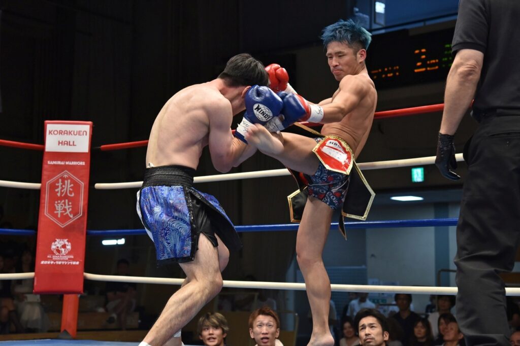 初回は蹴りから組み合う展開が増えた。偶然のバッティングで鬼久保海斗流が痛そうに蹲ること2度。更に股間ローブローもあって鬼久保は苦しい展開。ジャッジ三者が揃うラウンドは無かったが、僅かながら攻勢に立ったHIROKIが判定勝利。