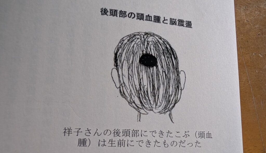 祥子さんの死からひと月後の2009年12月11日、遺族は西成署の捜査担当者と面談。捜査員は、祥子さんの遺体には「頭血腫」(ずけっしゅ)と「頸部圧迫痕」(けいぶあっぱくこん)があり、2つの傷は、第一発見者の釣り人が遺体を引き上げる際、誤って遺体を落とし、できたものと説明した。「鑑定書」に納得いかない遺族は、解剖医に説明を聞きたいと申し出、捜査員と医師、遺族の3者での面談。医師からは「頭血腫は平らな鈍体よって出来たこと、生活反応があったこと(生きていた時にしかできない)、それによって脳震盪(のうしんとう)を起こしたと説明をうけた。警察が説明した、釣り人が遺体を引き上げるとき誤って落として出来たものは噓だったことがわかった。