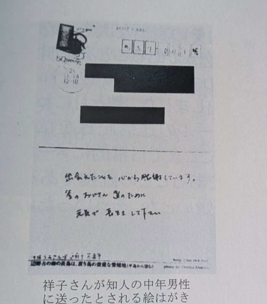 【注】祥子さんが亡くなる直前、祥子さんからハガキを受け取った男性Mさんが、絵ハガキを西成警察に届けた。ハガキには「出会えたことを心から感謝しています。釜のおじさんたちのために元気で長生きしてください」とあった。男性(当時60歳)は当時釜ヶ崎の労働組合の組合員であり、K診療所の患者でもあった。なお群馬で執り行われた葬儀の席で、釜ヶ崎のNPO団体の女性(当時)から、「祥子さんには交際していた男性がいた」と告げられた。それがMさんだった。