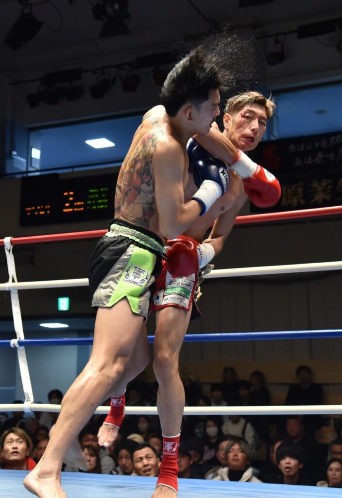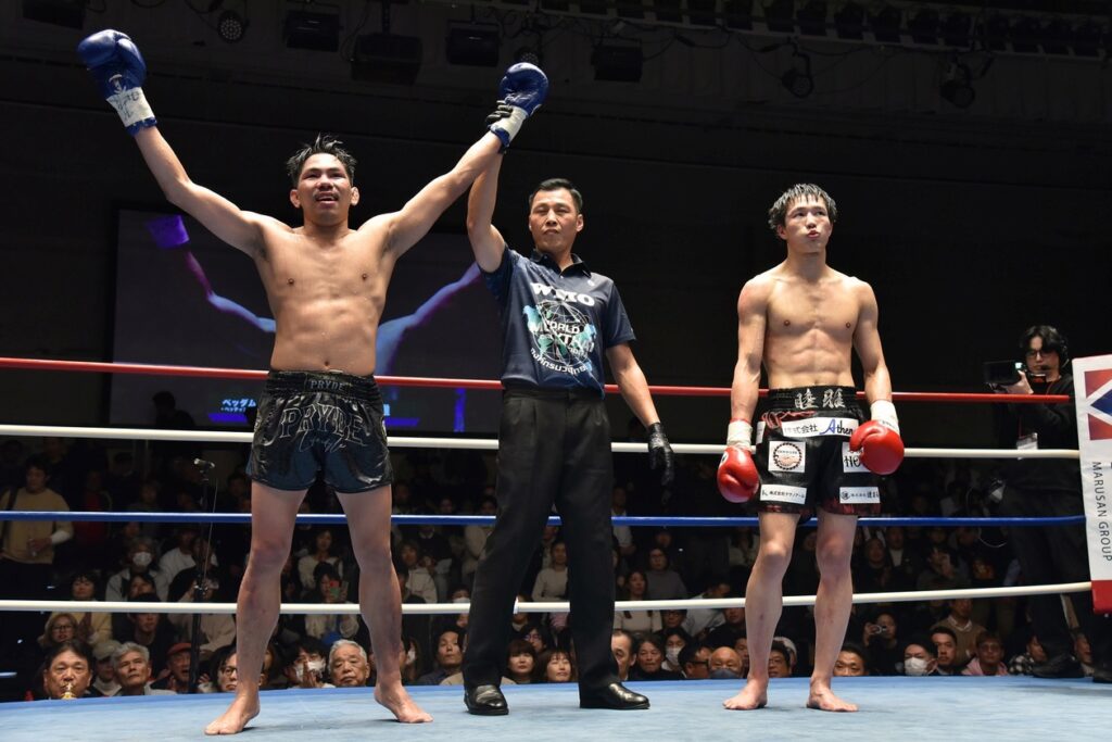 ローキックで調子を上げていく細田昇吾。ソッサイも応じて多彩に蹴るも、細田の勢いが優り距離感を掴んでパンチ連打で追い込み、左ボディブロー二度ヒットさせるとソッサイは苦しそうに崩れ落ち、テンカウントを数えられた。