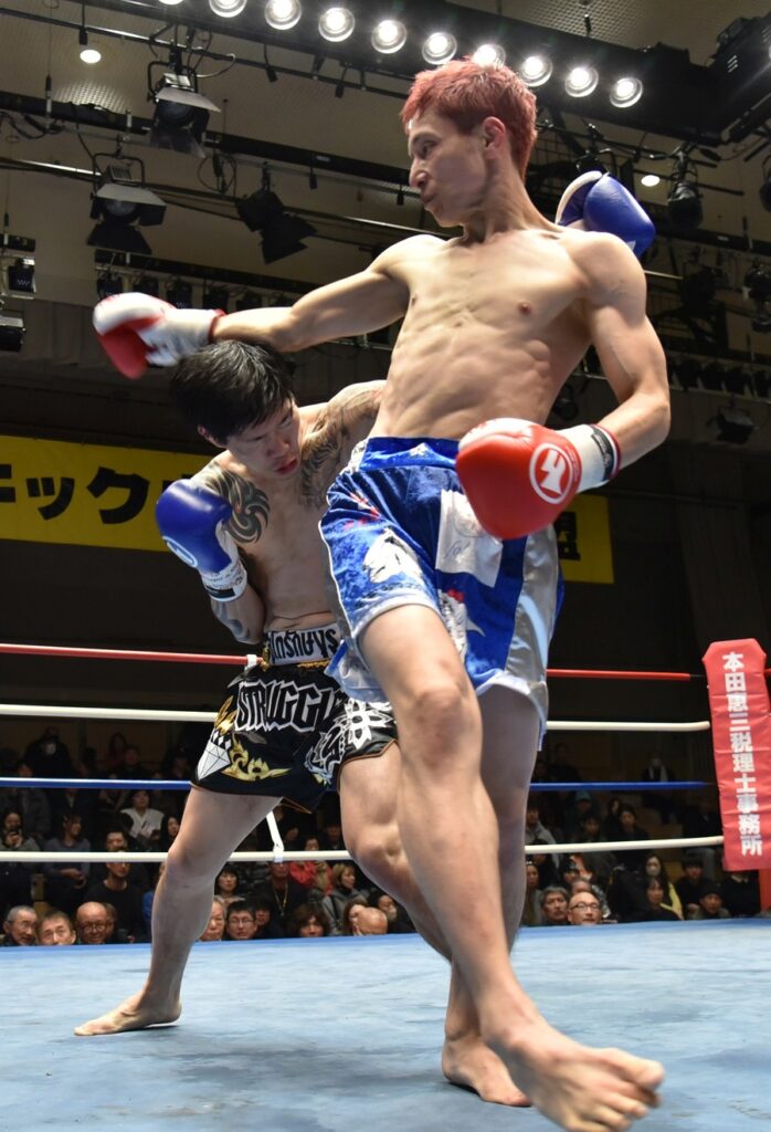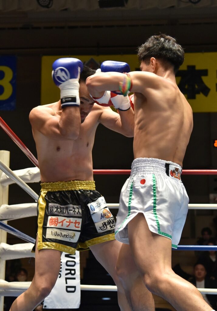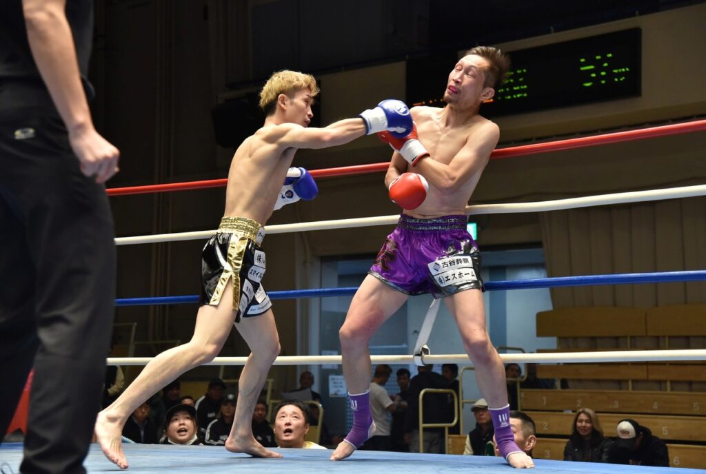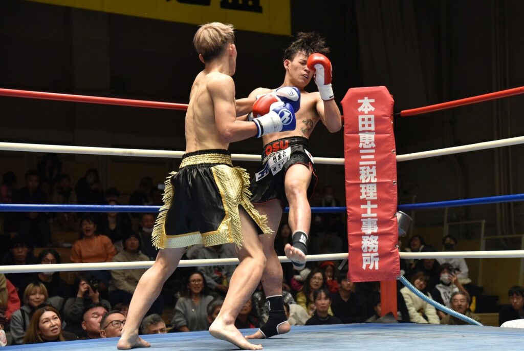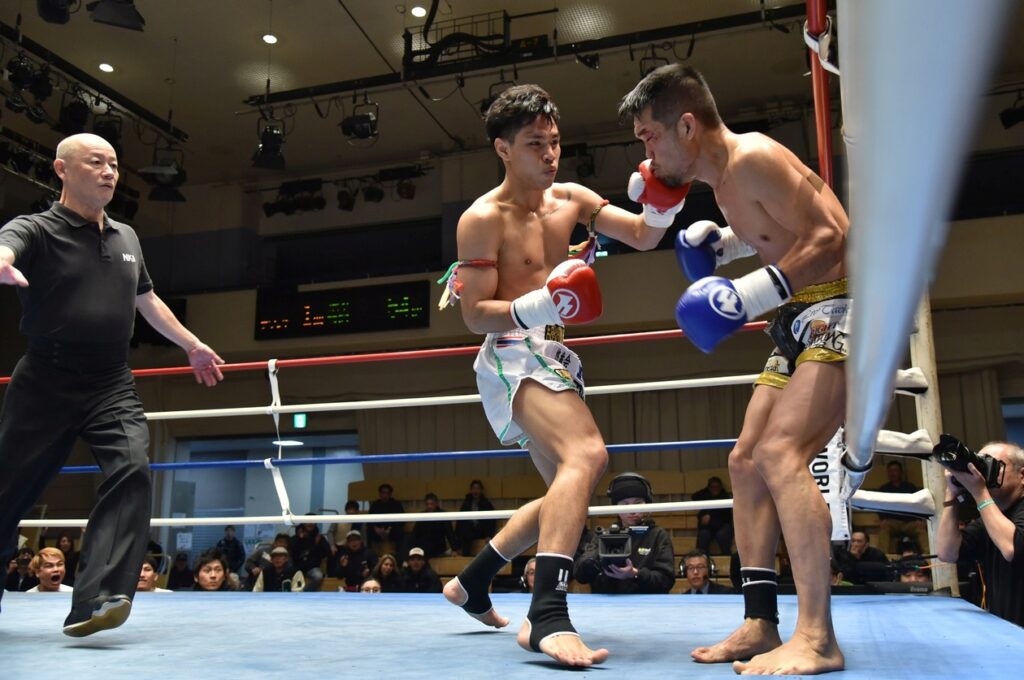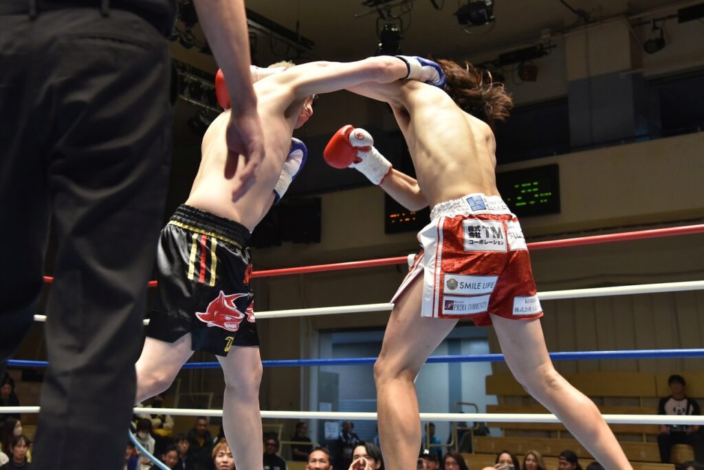 蹴りとパンチの探り合いのアグレッシブな攻防が続く。前進してパンチラッシュする清水和也と下がりながらも左ストレートカウンターとミドルキック、ハイキックのリズムが攻勢を維持して菅野登生が判定勝利。