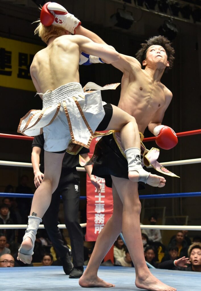 初回のパンチとローキックで先にリズム掴んだのは滑飛シオン。第2ラウンドには緒方愁次の飛びヒザ蹴りに右ストレートカウンターでノックダウンを奪った。ダメージは小さいがスリップ気味で身体が流れた尻餅ダウンではあった。第3ラウンドもシオンの優勢維持。展開は変わらずシオンが判定勝利。