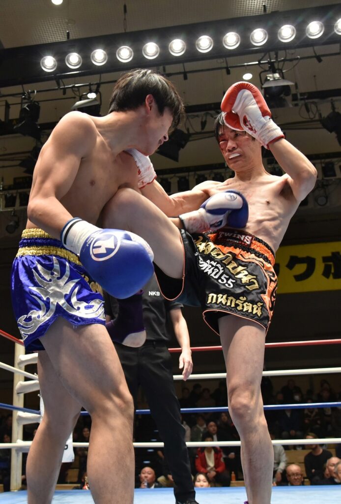 両者、軽い蹴りで距離を計る様子見はセーンダーオレックの間合いの取り方が上手い。大月慎也の蹴り終わりを狙った左ストレートで後退させるとパンチヒジ打ちの連打で追い込む。大月は左眉尻を切られた様子で、セーンダーオレックは組み付いてのヒザ蹴り、左フックが当たったか、大月は崩れ落ちノックダウンとなった。