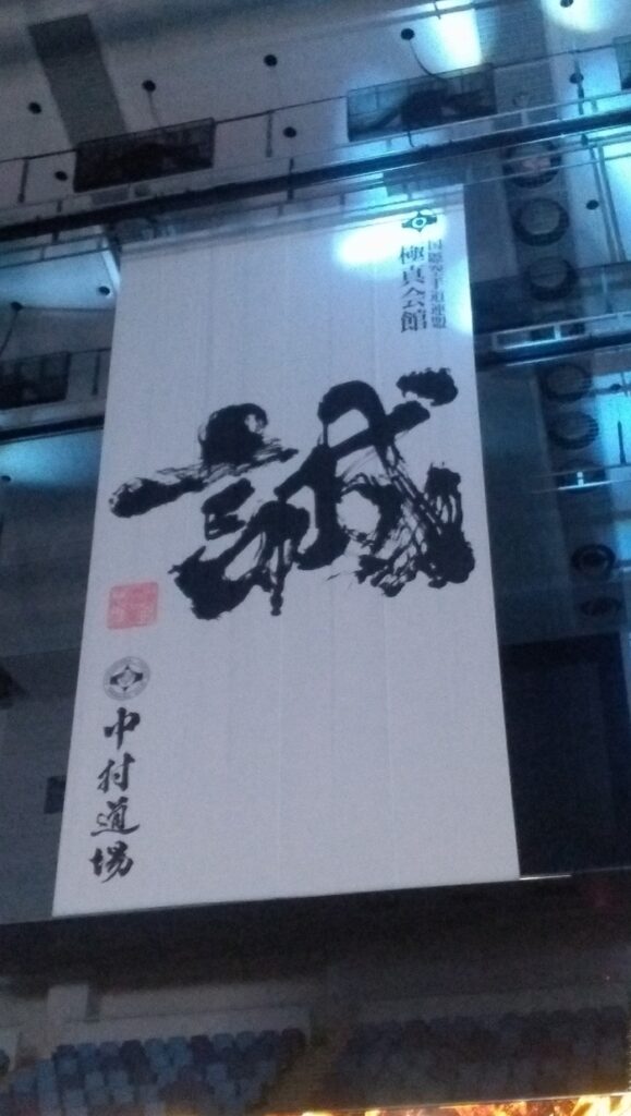 ご存知の方もおありかと察しますが、龍一郎は、かつて空手界の巨人・大山倍達師範存命中、無差別級で2回連続して世界チャンピンになった、空手界のレジェンド・中村誠総帥が主宰される極真会館中村道場のシンボルロゴ(誠)を揮毫しています。大会ごとに下げられ、会員証にも使われています。