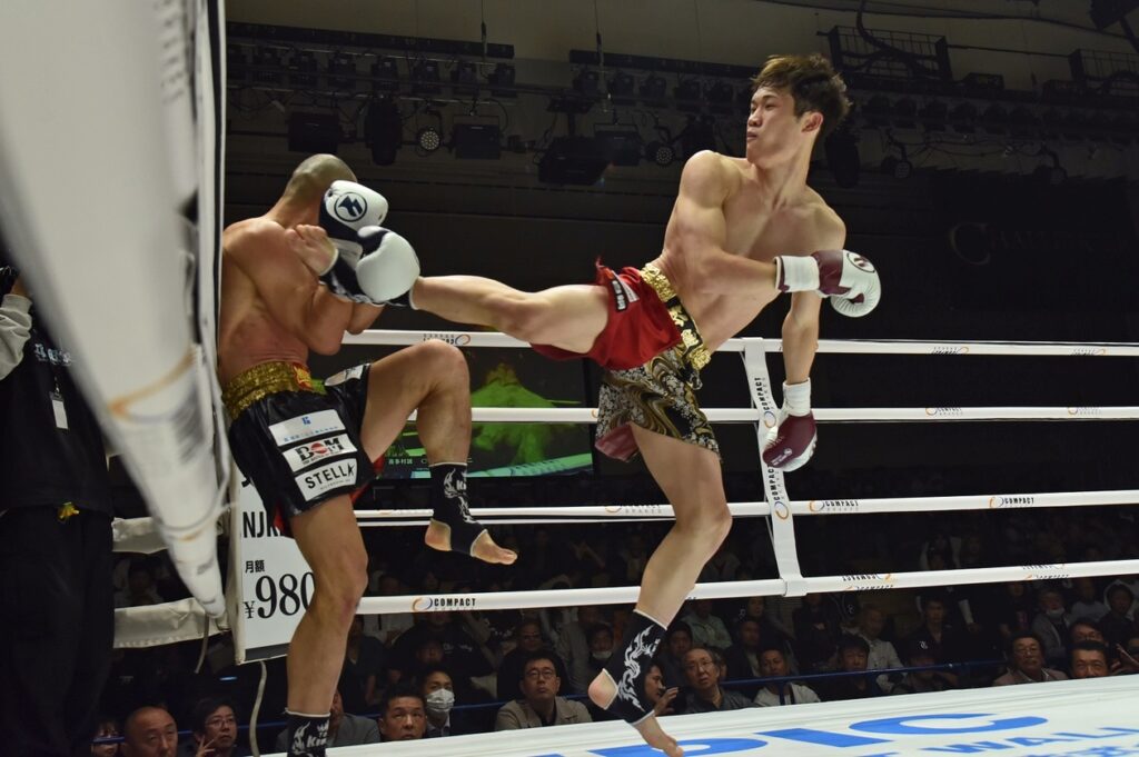 反面、後ろ蹴りを得意とする選手は主にボディー狙いで、アゴを突き上げるほど高く蹴る者は少ない。NJKFウェルター級チャンピオンの小林亜維二は昨年、喜多村誠に高い位置へ蹴り上げたので、今後もアゴを狙った後ろ蹴りを使う機会は見られるかもしれません。
