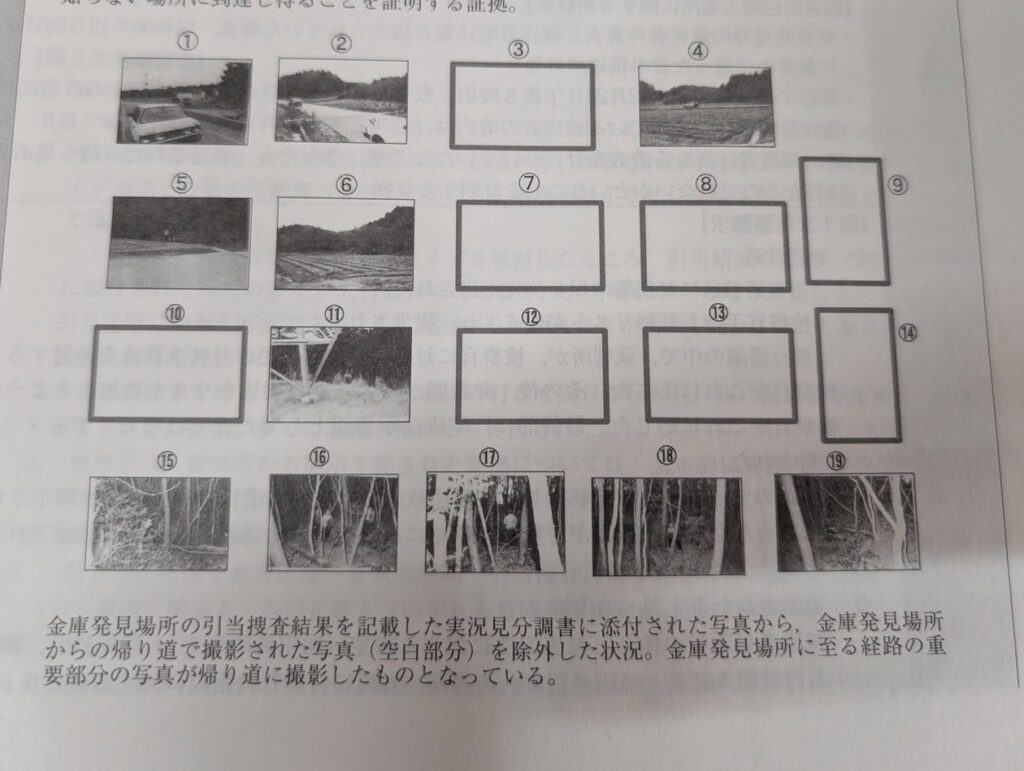 しかし弁護団が、これらの写真のネガの番号を調べたところ、順番が全く間違っていることが判明した。しかもネガには、発見現場に行く「往路」の写真はほとんどなく、金庫の発見現場である到達点から、警察車両に戻ってくる「復路」で撮った写真ばかりだった。そもそも阪原さんが犯人で現場を知っているならば、現場に向かう「往路」の写真だけ撮れば十分なのに、「何故往路の写真が撮られてないのか?」。弁護団に疑問が湧いてきた。さらに調べると、現場に行く際撮ったとされた写真の何枚かが、現場からの帰り道に撮られたものであることも判明した。本当ならば警察車両に向かって戻ってくるはずの「復路」の場所で、阪原さんが反対側を向かされ写真を撮られていた。捜査官が復路で撮った写真を往路の写真としてネガを入れ替えていたのだ。── 引用終わり