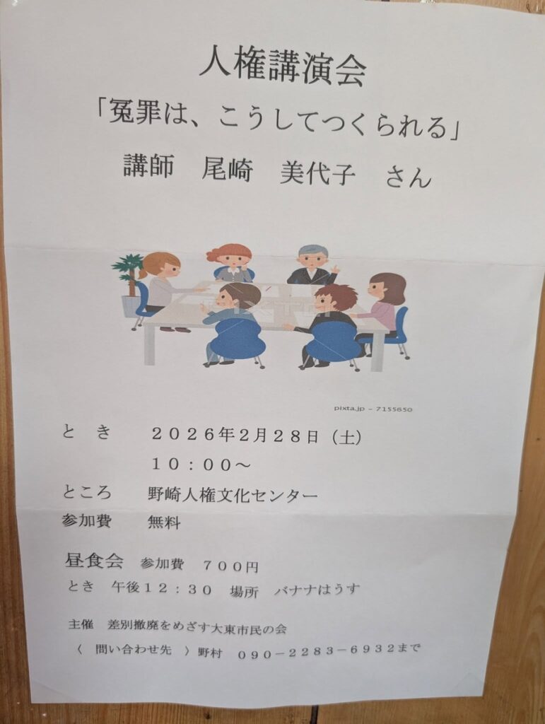 ◎本日2月28日(土)午前10時~大東市の野崎人権文化センターにて尾﨑美代子さん講師による人権講演会「冤罪はこうしてつくられる」開催されます。参加費無料