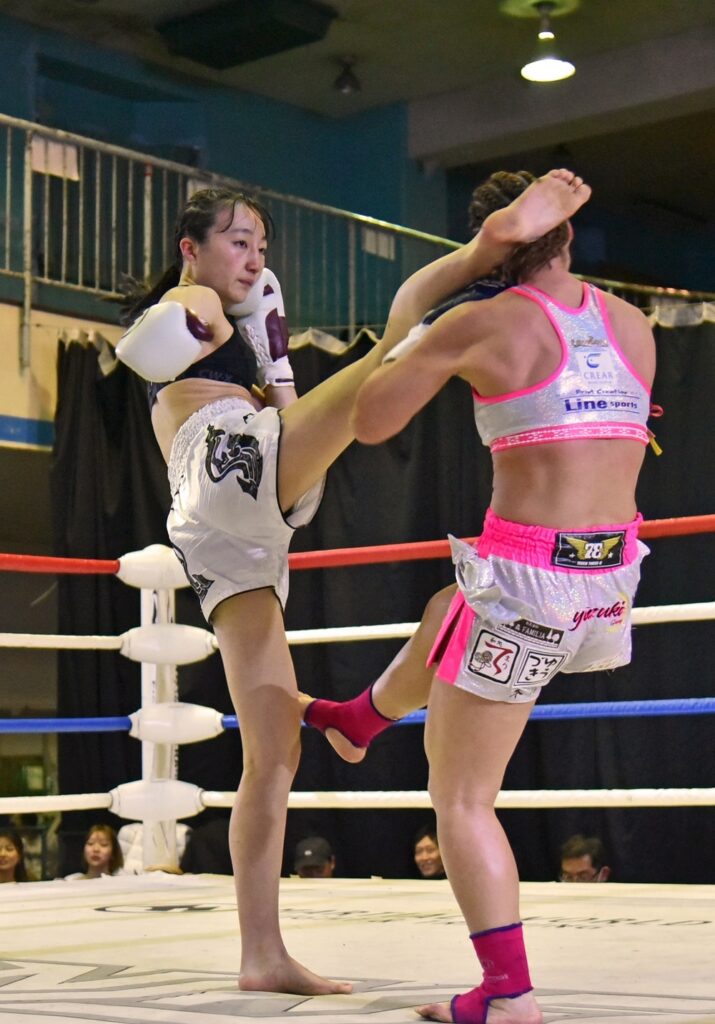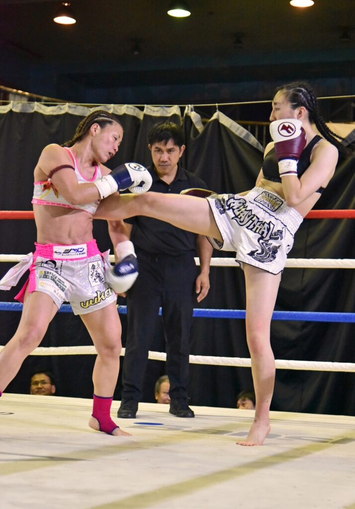両者激しくパンチ蹴りの多彩な攻防を見せたが、朱乃はミドルキックや前蹴りがインパクトあるヒットを見せ、大差判定勝利。