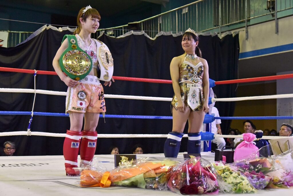 ミネルヴァ・ピン級とペーパー級の二階級制覇と昨年8月9日にオーストラリアでWBCムエタイ女子世界ミニマム級王座獲得した撫子と、昨年10月26日、ウーバーミユとの王座決定戦に僅差で敗れたAIKOが揃って引退セレモニーが行われました。