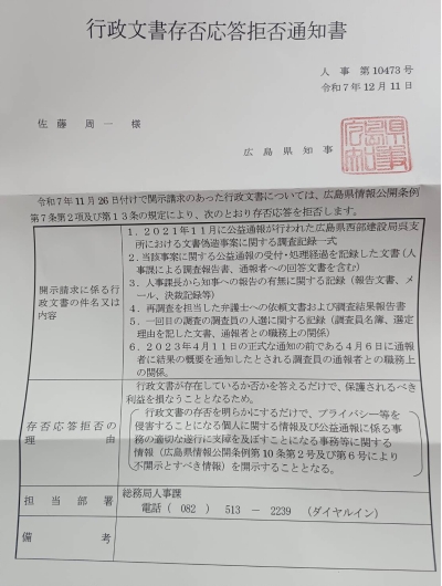 その答えは、あまりにも痛ましい現実です。広島県庁には、公益通報を守るどころか“潰す”体質があった。通報は握りつぶされ、調査は遅れ、責任は矮小化された。そして、本紙の情報公開請求に対しても、文書の存在すら答えない「存否応答拒否」で答える。その結果、県民のお金で国に補助金を返還するという最悪の事態を招きました。