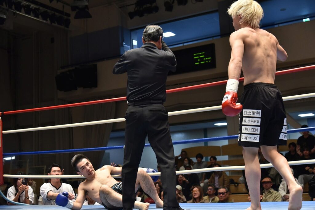 第2ラウンドは瀬戸口が自分のリズムを引き寄せようとパンチを狙って出て来た。打ち合えば瀬戸口が有利と見られるが、赤平のローキックが効いてきた瀬戸口は脚を引き摺りだし、大きくバランスを崩したところを蹴られるとついにノックダウンを喫してしまった。まだ余力はあるもラウンド終了。