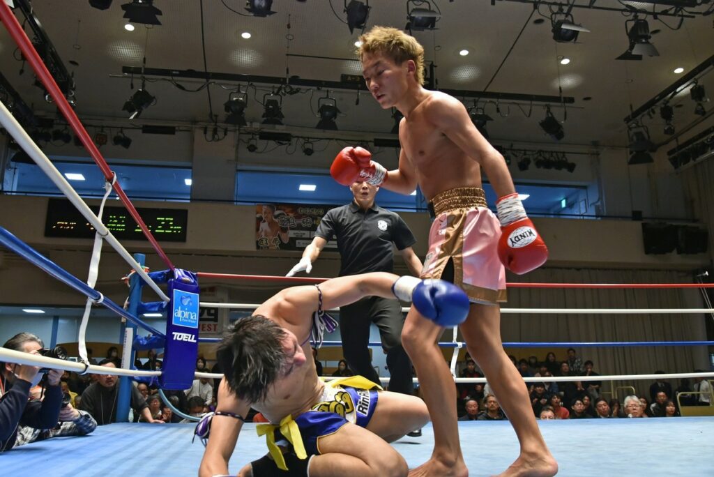 初回は様子見も中泉翔の勢いがやや圧す流れも、第2ラウンドには徐々にTAKUYAが蹴りからパンチの攻勢を強め、第3ラウンドにはより勢い増して行く中、中泉は表情に余裕は無くなる中、TAKUYAはタイミング見てパンチでノックダウンを奪って判定勝利。