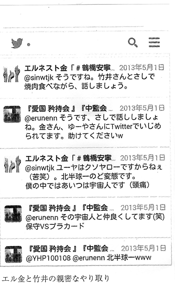 この事件は、M君が2013年4月に、金良平とネトウヨ団体「愛国矜持会」「中監会」を主宰する竹井信一が名刺交換する場面を目撃し、さらにリンチ事件以前にネトウヨ活動家2名が竹井と通じている者がいると暴露され、このやり取りにあるように昵懇な関係にあり金銭の授受があるのではないかと、リンチに連座した「凡」こと李普鉉に相談したことによります。これ以前にも、他の運動仲間から竹井との付き合いを諫められていたそうで、それを凡が金良平らに伝えたことで、金良平の怒りを買いリンチに繋がっていくのです。人間、真実を衝かれると逆切れすると言いますが、私見は、おそらく金銭の授受があったと推察されても致し方ない、ということです。
