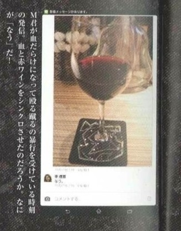 所はワインバー、リンチの最中にも、悠長にツイートしています。李信恵の無慈悲な人間性が判るツイートです。いみじくも、彼女が、まともに差別問題や人権など考えていないことを象徴するツイートです。