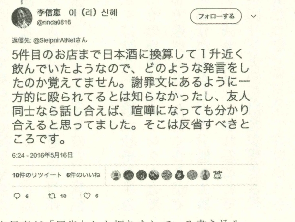 【4】無防備にリンチ当夜を振り返る李信恵のツイート