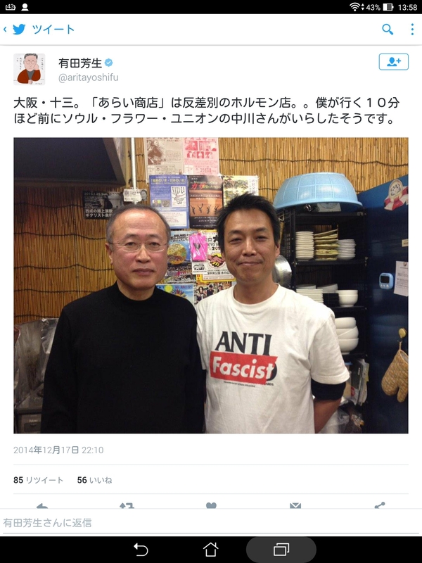 リンチが行われたのは2014年12月17日未明ですが、その日のうちに、しばき隊系国会議員・有田芳生が、リンチに至る飲み会の1軒目の大阪・十三(じゅうそう)に在る「あらい商店(現ピンナ食堂)」を訪れ情報収集に努めています。有田のツイートによれば、有田の前にソウル・フラワー・ユニオンの中川敬が訪れています。それから5軒の飲食店を回り、5軒目のワインバーで事件は起きます。