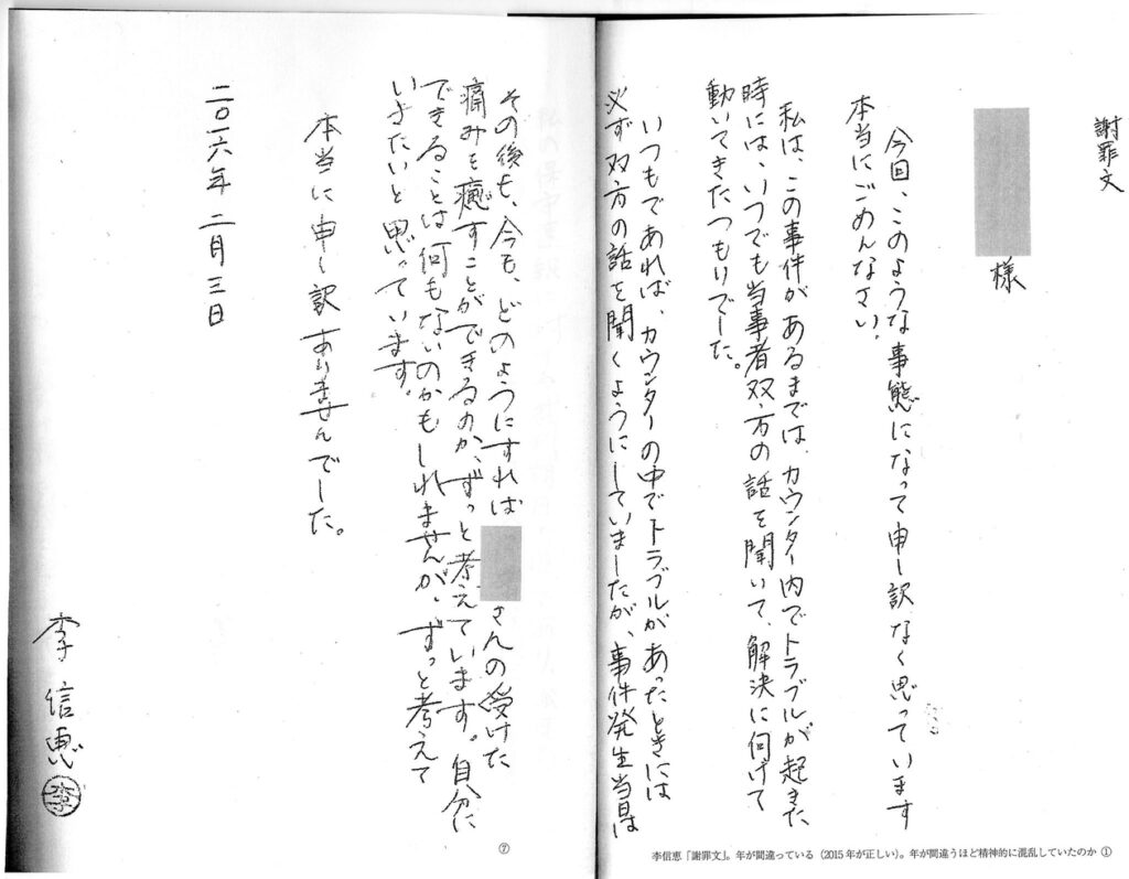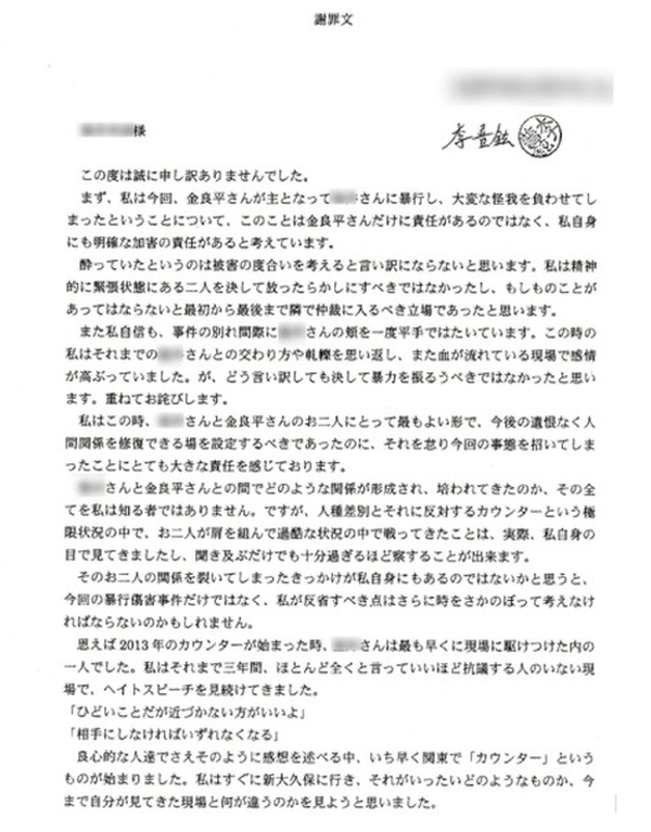 【8】リンチに連座しM君を一発殴った李普鉉の「謝罪文」