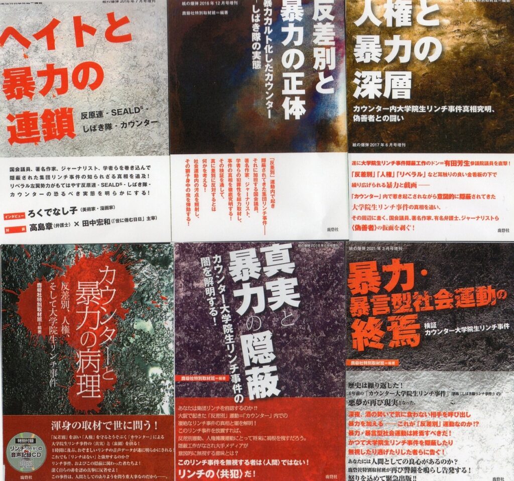 2014年12月に、大阪屈指の飲食街・北新地で起きた、俗に「しばき隊リンチ事件」といわれる「カウンター大学院生リンチ事件」から11年余りが経ちました。詳しい内容と経緯については、私たちが血の滲む想いで取材し編纂した6冊のムック本(『紙の爆弾』増刊号)をぜひご一読ください。「しばき隊」なる黒百人組組織が、11年余り経った今、野間易通はじめとする活動家が生き残り、さらに新たな活動家を増殖させ社会に悪印象を持って注目されていることで、このリンチ事件が全く反省も総括もされていないことを想起していただきたいと思います。