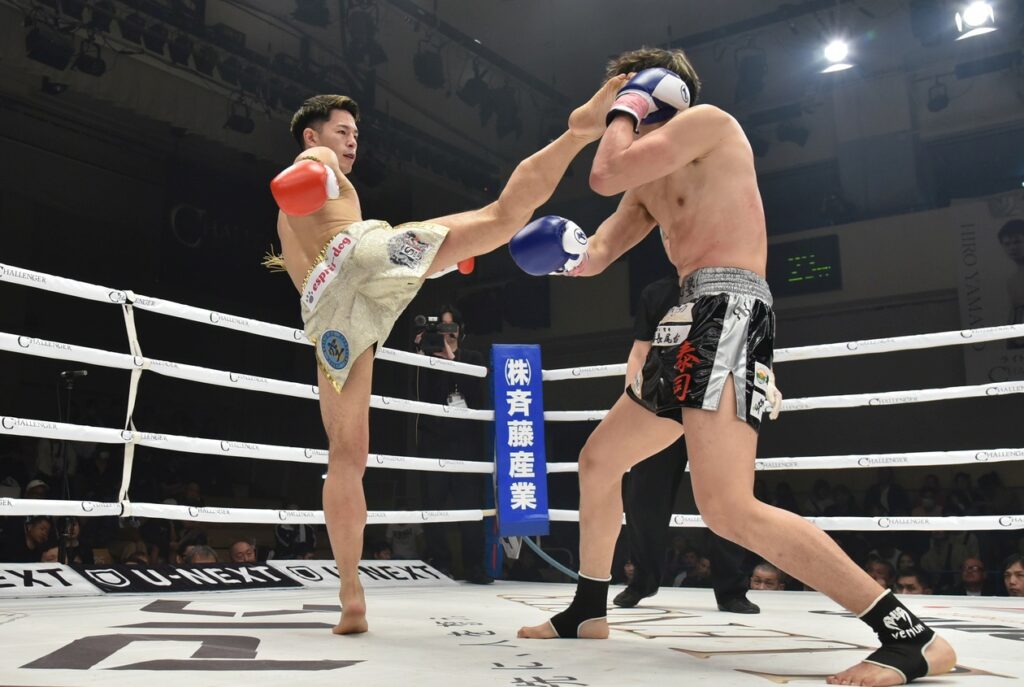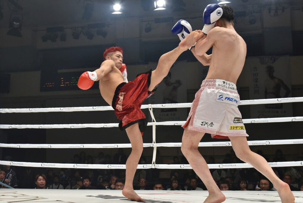 初回の様子見は両者のローキックから始まり、体格差で優る基康のパワーある上下の蹴りとパンチで高橋幸光を追い詰め、高橋は太腿や脇腹を蹴られて真っ赤にしながら蹴り返して突破口を探る。