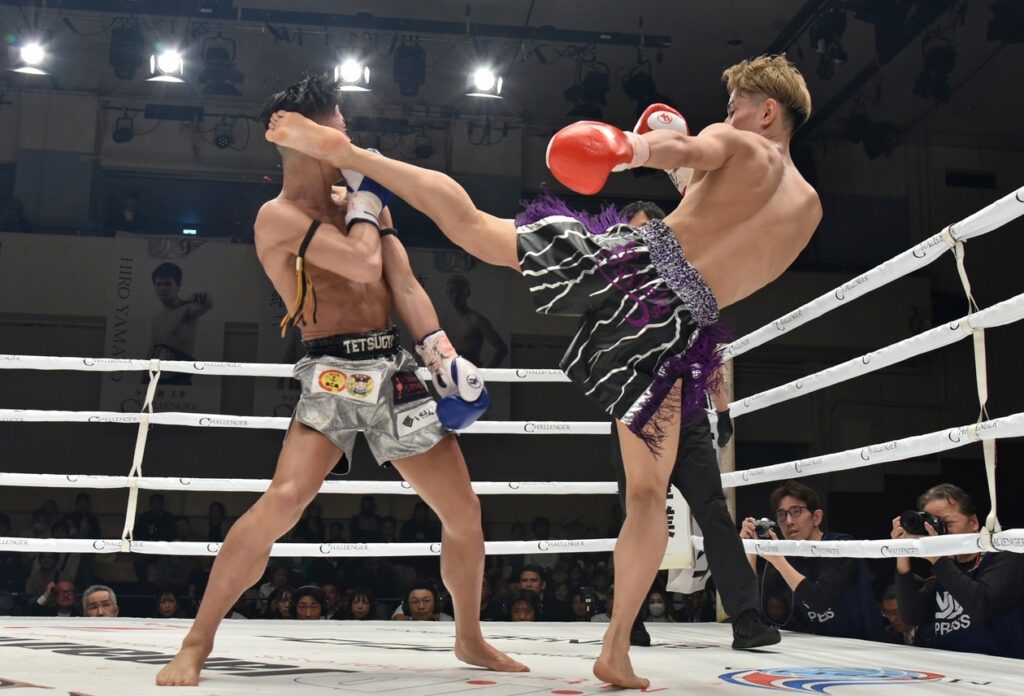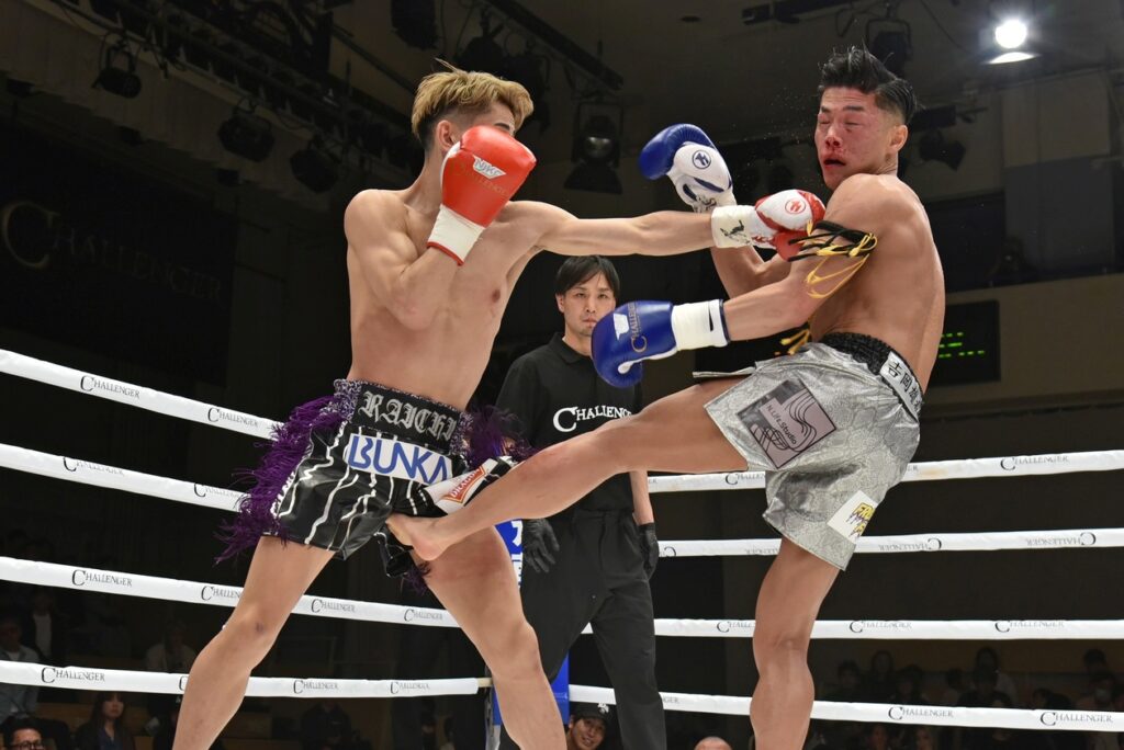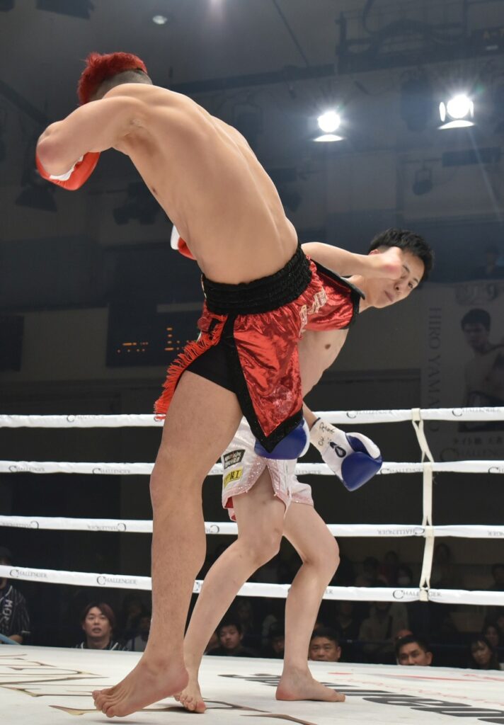 初回、パンチと蹴りの交錯は匠がやや圧力掛けて前進する流れも篤志の左ストレートでノックダウン。ラウンド終了間際も篤志のパンチ連打で匠が崩れたが、スリップ扱いながら効いていた様子。